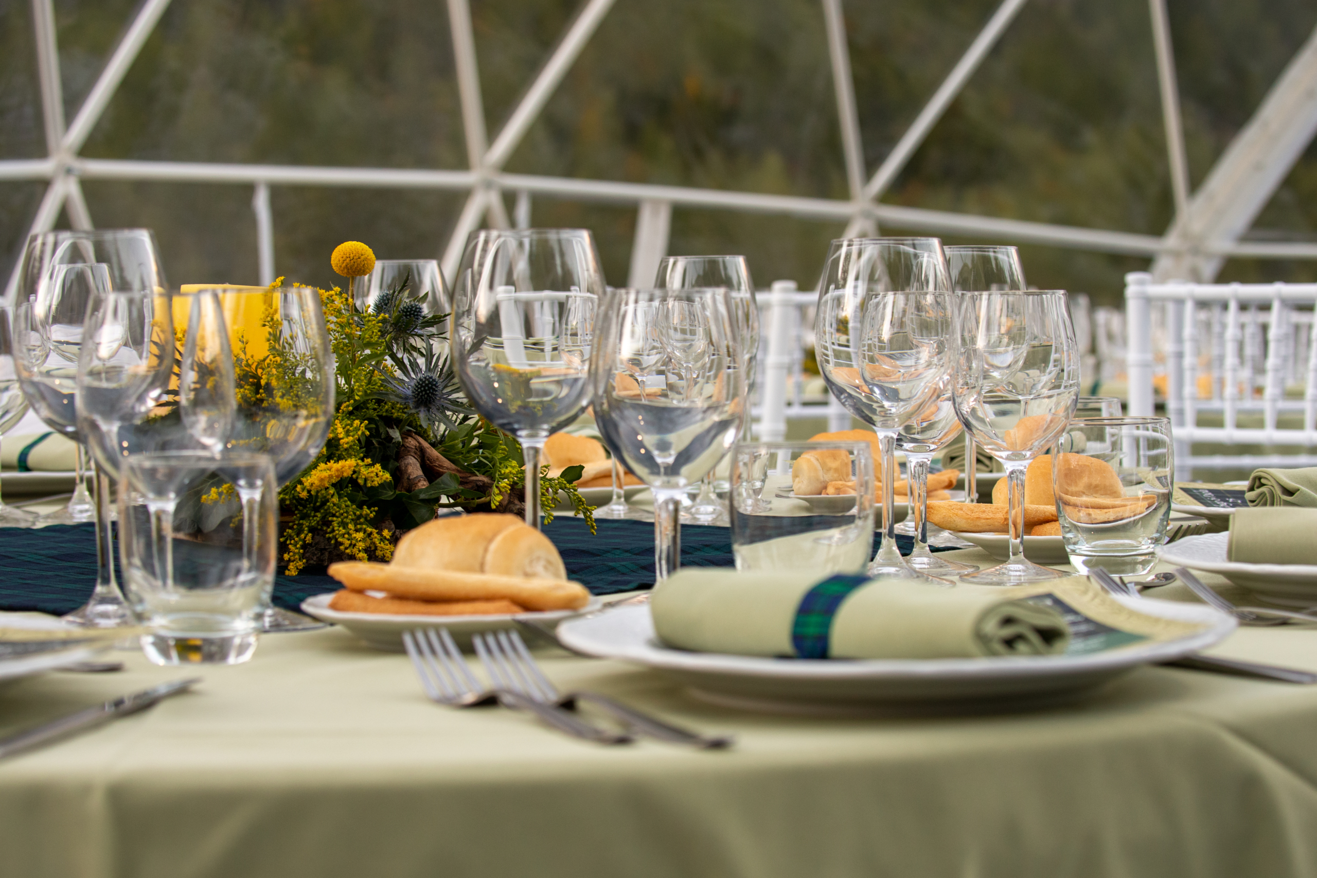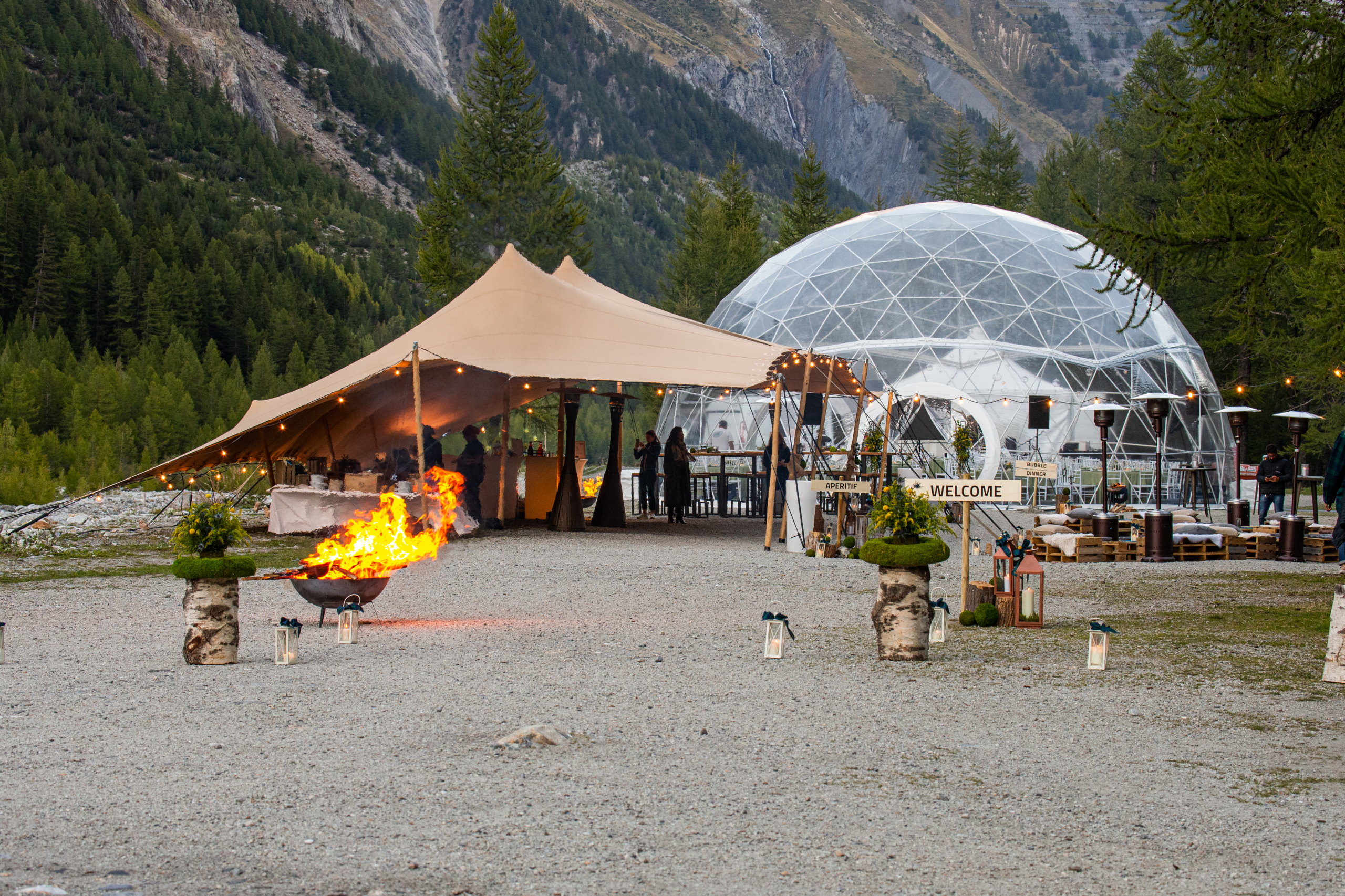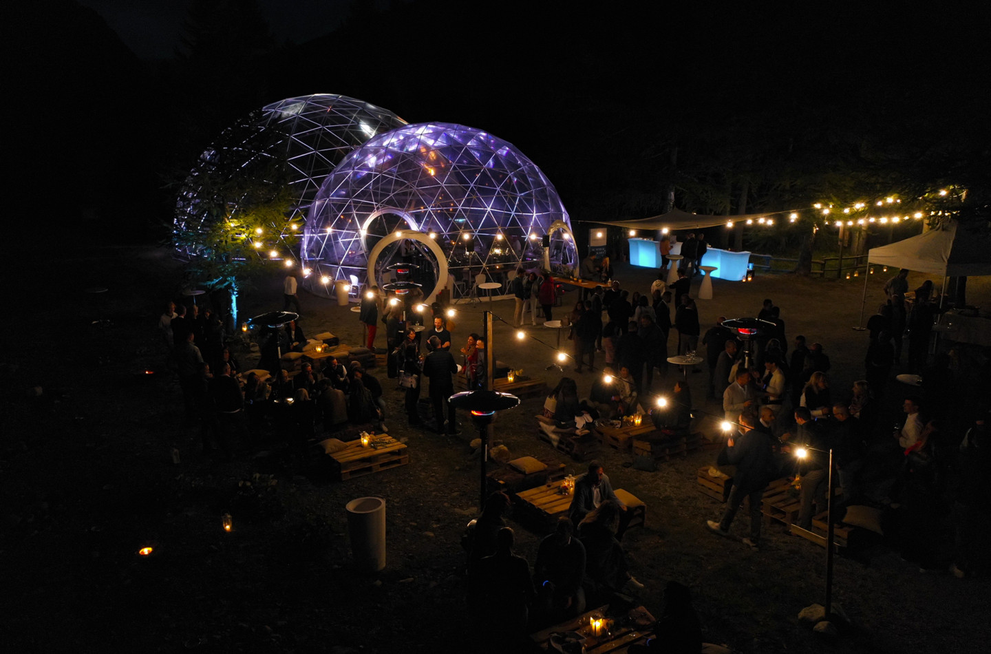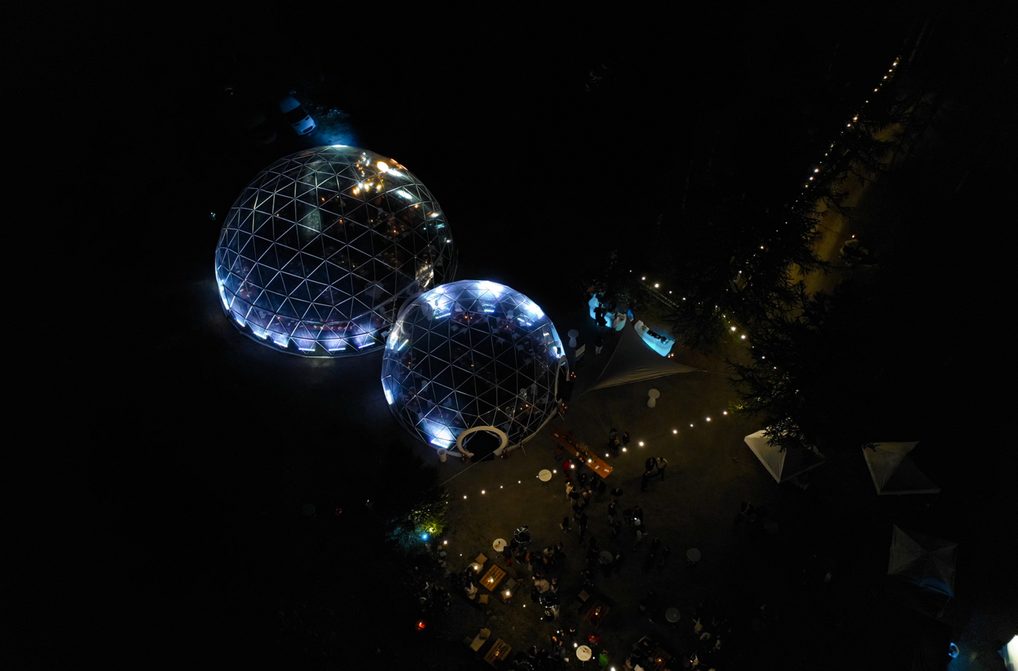 Immagina il brivido dell’attesa mentre gli ospiti vengono guidati attraverso il tranquillo paesaggio naturale, la loro curiosità cresce ad ogni passo senza sapere dove si stia andando. L’emozione aumenta fino a quando, all’improvviso, intravedono lo spettacolo incantevole che li aspetta: una struttura geodetica trasparente, illuminata e splendidamente allestita con un’area lounge esterna, che brilla dolcemente contro il cielo notturno.
