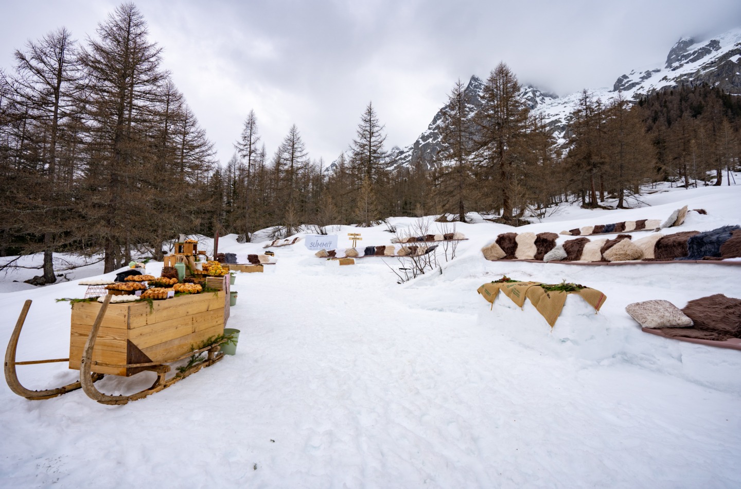 Imagine being immersed in a magical village entirely sculpted from snow, where every detail evokes the essence of the Alpine winter. Snow-made walkways, seating areas, and tables blend seamlessly with the surroundings, creating a fairytale setting. Comfortable cushions and synthetic furs, surrounded by branches, pinecones, and berries, turn the winter chill into a warm and natural embrace.